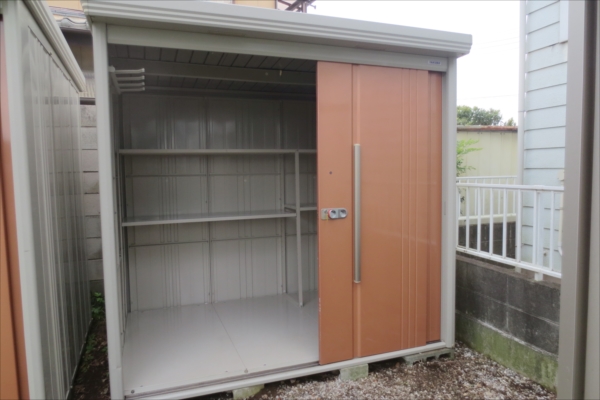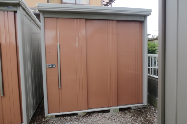 サイズは、間口2200(2280)×奥行1590(1795)×高さ2110(2060)mm の中型物置です。